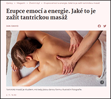 Rozchechtám se. Alena je živel. Chytne mě za boky a v mžiku ze mě dělá mužské zemětřesení, až mi ze zad odlétá první nahřátý lávový kámen. Cítím na kůži horké žínky, olej. A masáž! Zažívám masáž lingamu. Chvílemi hluboce vydechnu, zažil jsem v životě leccos, ale jako by se moje tělo chtělo dosytit jemností a pomalostí. Cítím vibrace, lehké příjemno. Žádné cílené směřování k takzvanému happy endu popisovanému při erotických masážích, které se často za tantru schovávají.
