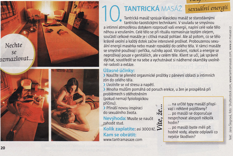 Tantrická masáž si pomalu nachází cestu i do tištěných periodik a stává se tak součástí běžného života společnosti. Dalším průkopnickým časopisem se stal Blesk Zdraví (květen 2010), který zařadil naše tantra masáže do svého průvodce 10ti nejlepšími masážemi. Jen více takových osvícených časopisů :-).